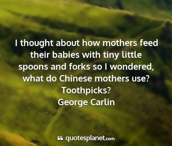 I thought about how mothers feed their babies with tiny little spoons and forks so I wondered, what do Chinese mothers use? Toothpicks?George Carlin