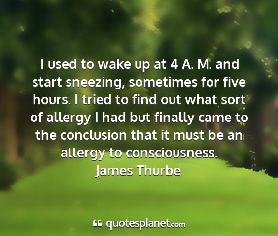 I used to wake up at 4 A. M. and start sneezing, sometimes for five hours. I tried to find out what sort of allergy I had but finally came to the conclusion that it must be an allergy to consciousness.James Thurbe