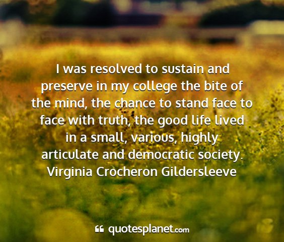 I was resolved to sustain and preserve in my college the bite of the mind, the chance to stand face to face with truth, the good life lived in a small, various, highly articulate and democratic society.Virginia Crocheron Gildersleeve