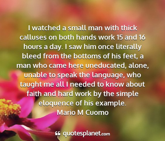 I watched a small man with thick calluses on both hands work 15 and 16 hours a day. I saw him once literally bleed from the bottoms of his feet, a man who came here uneducated, alone, unable to speak the language, who taught me all I needed to know about faith and hard work by the simple eloquence of his example.Mario M Cuomo