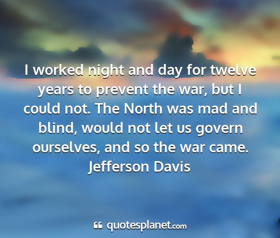 I worked night and day for twelve years to prevent the war, but I could not. The North was mad and blind, would not let us govern ourselves, and so the war came.Jefferson Davis