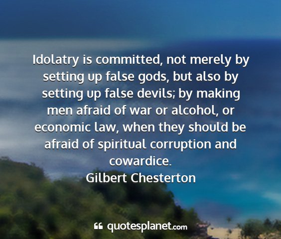Idolatry is committed, not merely by setting up false gods, but also by setting up false devils; by making men afraid of war or alcohol, or economic law, when they should be afraid of spiritual corruption and cowardice.Gilbert Chesterton
