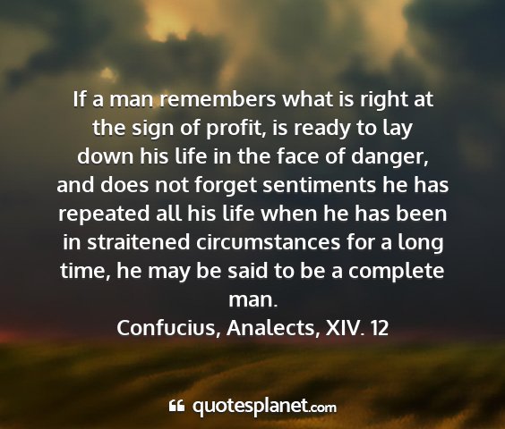 If a man remembers what is right at the sign of profit, is ready to lay down his life in the face of danger, and does not forget sentiments he has repeated all his life when he has been in straitened circumstances for a long time, he may be said to be a complete man.Confucius, Analects, XIV. 12