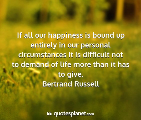 If all our happiness is bound up entirely in our personal circumstances it is difficult not to demand of life more than it has to give.Bertrand Russell