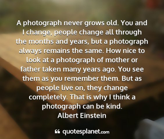 A photograph never grows old. You and I change, people change all through the months and years, but a photograph always remains the same. How nice to look at a photograph of mother or father taken many years ago. You see them as you remember them. But as people live on, they change completely. That is why I think a photograph can be kind.Albert Einstein