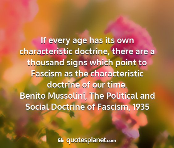 If every age has its own characteristic doctrine, there are a thousand signs which point to Fascism as the characteristic doctrine of our time.Benito Mussolini, The Political and Social Doctrine of Fascism, 1935