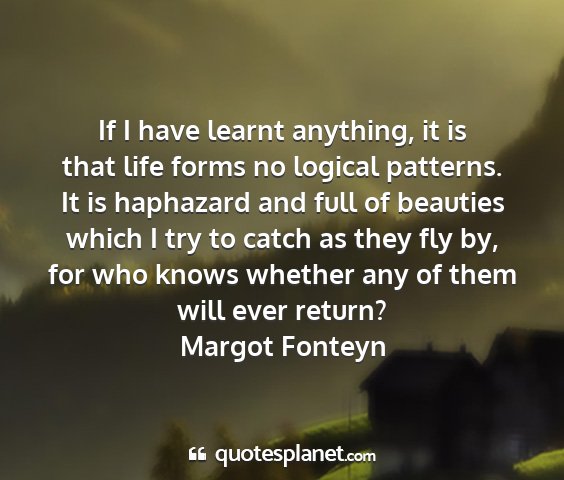 If I have learnt anything, it is that life forms no logical patterns. It is haphazard and full of beauties which I try to catch as they fly by, for who knows whether any of them will ever return?Margot Fonteyn