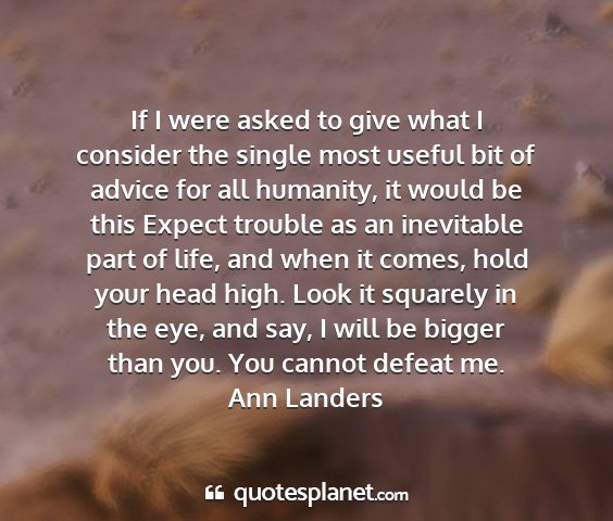 If I were asked to give what I consider the single most useful bit of advice for all humanity, it would be this Expect trouble as an inevitable part of life, and when it comes, hold your head high. Look it squarely in the eye, and say, I will be bigger than you. You cannot defeat me.Ann Landers