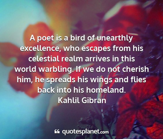 A poet is a bird of unearthly excellence, who escapes from his celestial realm arrives in this world warbling. If we do not cherish him, he spreads his wings and flies back into his homeland.Kahlil Gibran