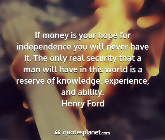 If money is your hope for independence you will never have it. The only real security that a man will have in this world is a reserve of knowledge, experience, and ability.Henry Ford