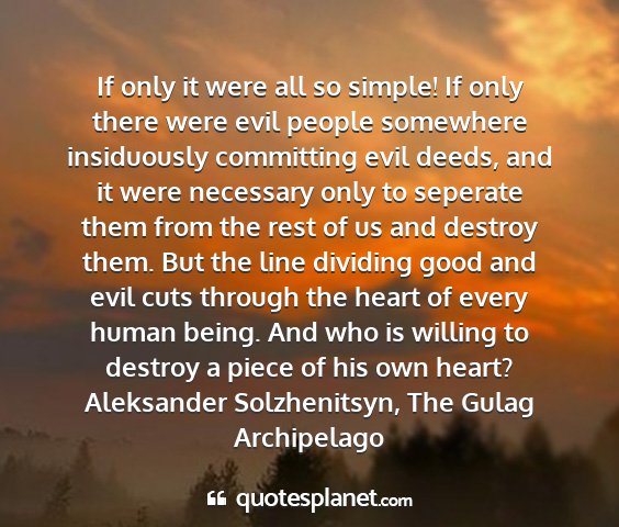 If only it were all so simple! If only there were evil people somewhere insiduously committing evil deeds, and it were necessary only to seperate them from the rest of us and destroy them. But the line dividing good and evil cuts through the heart of every human being. And who is willing to destroy a piece of his own heart?Aleksander Solzhenitsyn, The Gulag Archipelago