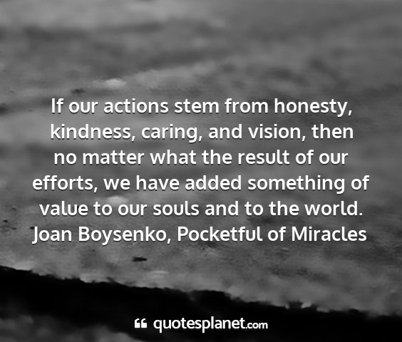 If our actions stem from honesty, kindness, caring, and vision, then no matter what the result of our efforts, we have added something of value to our souls and to the world.Joan Boysenko, Pocketful of Miracles