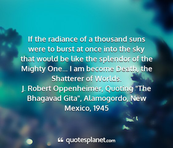 If the radiance of a thousand suns were to burst at once into the sky that would be like the splendor of the Mighty One... I am become Death, the Shatterer of Worlds.J. Robert Oppenheimer, Quoting "The Bhagavad Gita", Alamogordo, New Mexico, 1945