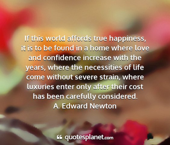 If this world affords true happiness, it is to be found in a home where love and confidence increase with the years, where the necessities of life come without severe strain, where luxuries enter only after their cost has been carefully considered.A. Edward Newton