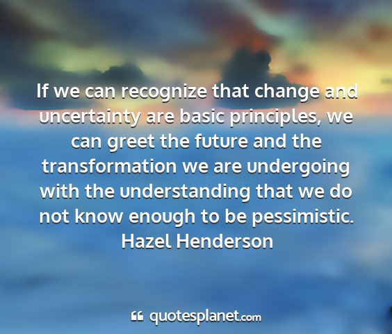 If we can recognize that change and uncertainty are basic principles, we can greet the future and the transformation we are undergoing with the understanding that we do not know enough to be pessimistic.Hazel Henderson