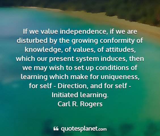If we value independence, if we are disturbed by the growing conformity of knowledge, of values, of attitudes, which our present system induces, then we may wish to set up conditions of learning which make for uniqueness, for self - Direction, and for self - Initiated learning.Carl R. Rogers
