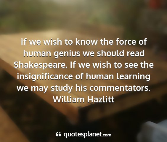 If we wish to know the force of human genius we should read Shakespeare. If we wish to see the insignificance of human learning we may study his commentators.William Hazlitt