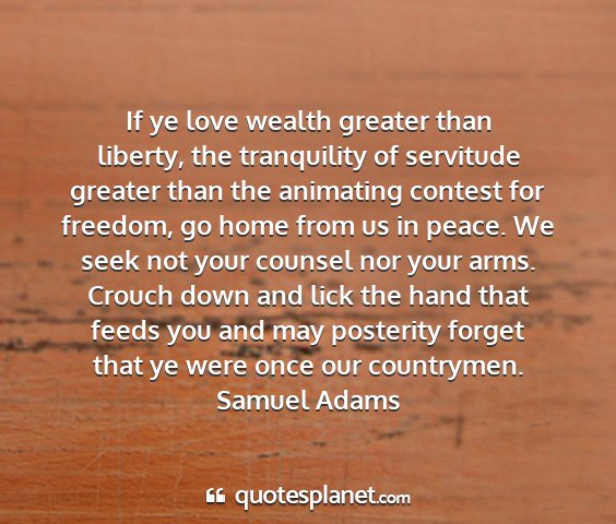 If ye love wealth greater than liberty, the tranquility of servitude greater than the animating contest for freedom, go home from us in peace. We seek not your counsel nor your arms. Crouch down and lick the hand that feeds you and may posterity forget that ye were once our countrymen.Samuel Adams