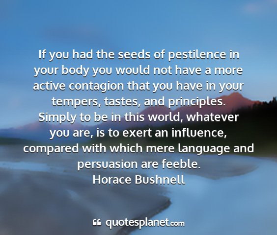 If you had the seeds of pestilence in your body you would not have a more active contagion that you have in your tempers, tastes, and principles. Simply to be in this world, whatever you are, is to exert an influence, compared with which mere language and persuasion are feeble.Horace Bushnell