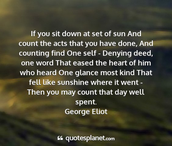 If you sit down at set of sun And count the acts that you have done, And counting find One self - Denying deed, one word That eased the heart of him who heard One glance most kind That fell like sunshine where it went - Then you may count that day well spent.George Eliot